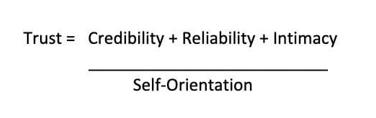 This equation says that trust is a function of how much credibility each person has with the others, how reliable each party is perceived to be, and how much intimacy has been built (all combining to form the numerator)—which is reduced by the degree to which each person is focused on themselves, their needs, and their interests (the denominator). By defining the concept of trust in more concrete terms, the team now has the ability to evaluate each component and intentionally find ways to enhance the numerator while mitigating the denominator.
